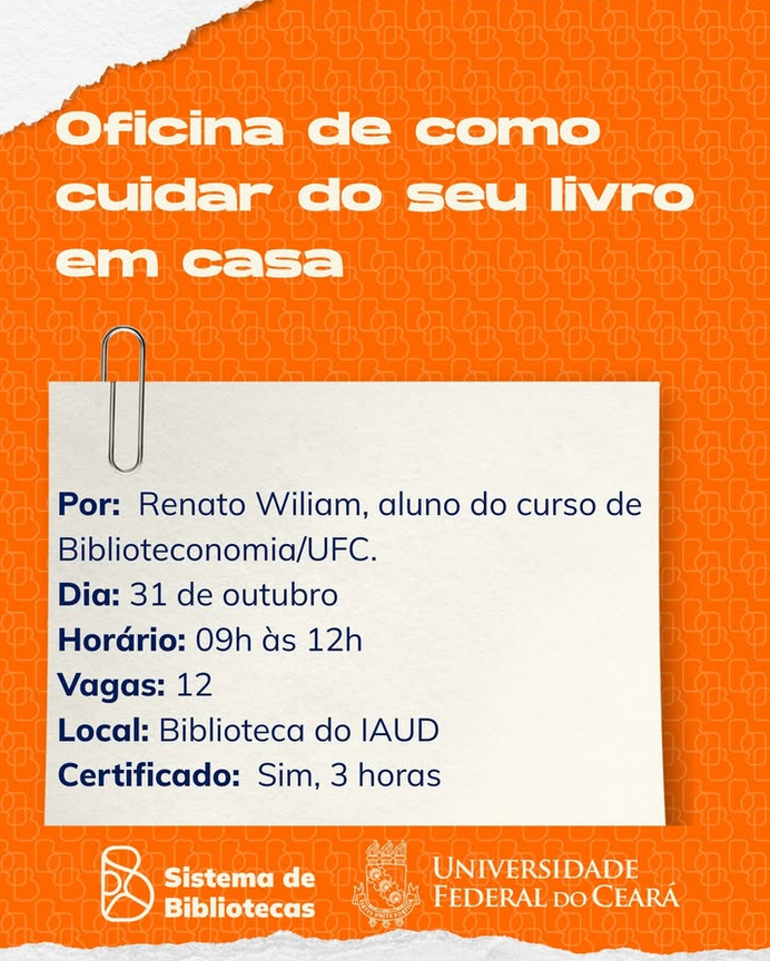 A Universidade Federal do Ceará (UFC), por meio do curso de Biblioteconomia, promoverá a oficina “Como Cuidar do Seu Livro Melhor” no dia 31 de outubro, das 9h às 12h, na Biblioteca do Instituto de Arquitetura, Urbanismo e Design (IAUD).