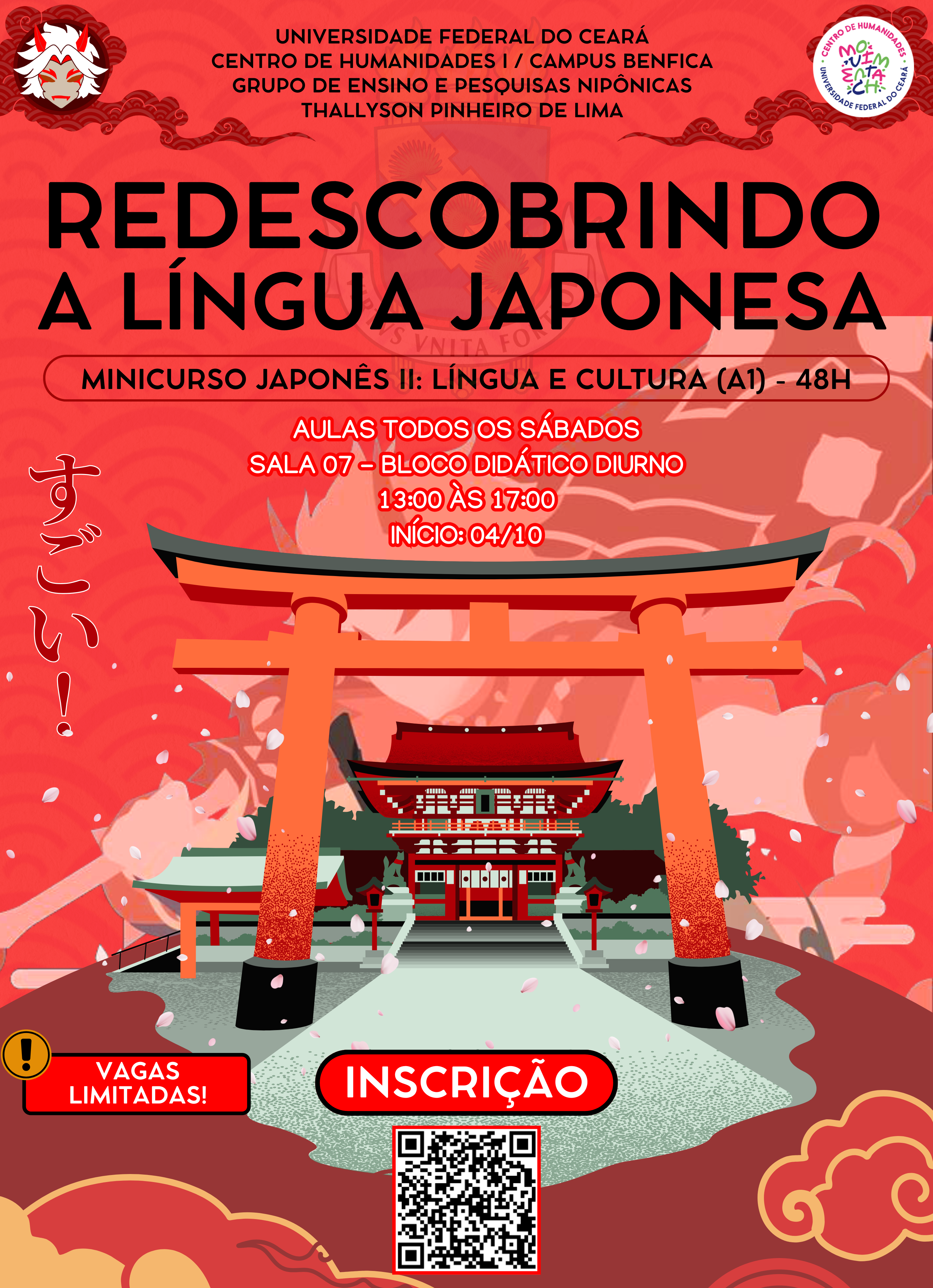 A partir deste sábado, 4 de outubro, o Grupo de Ensino e Pesquisas Nipônicas (GEPEN) da Universidade Federal do Ceará (UFC) ofertará o minicurso de japonês II – Língua e Cultura,  “Redescobrindo a Língua Japonesa”.