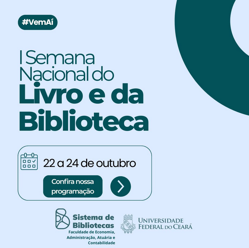 A Biblioteca da Faculdade de Economia, Administração, Atuária e Contabilidade (BFEAAC/UFC) realiza, de 22 a 24 de outubro, uma série de atividades na I Semana Nacional do Livro e da Biblioteca da BFEAAC. A programação inclui ações culturais, treinamentos voltados à pesquisa acadêmica e o tradicional reconhecimento ao leitor do ano.