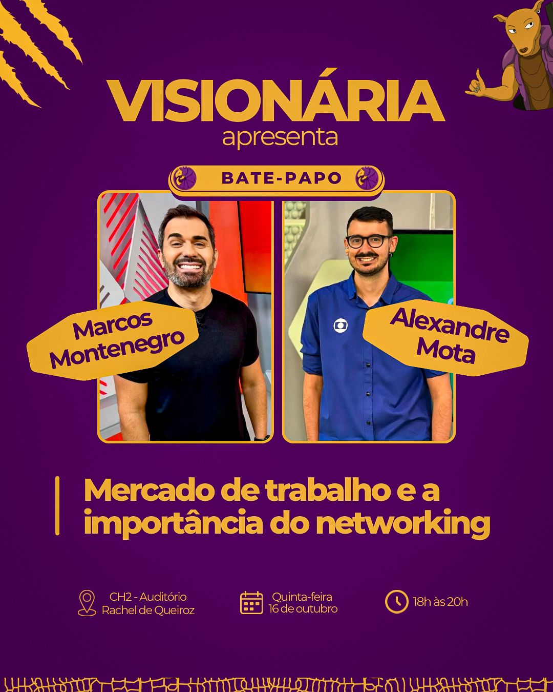 Nesta quinta-feira (16), das 18h às 20h, a Associação Atlética Acadêmica de Comunicação Social da Universidade Federal do Ceará (A.A.A Visionária) promove um bate-papo sobre mercado de trabalho e a importância do networking.