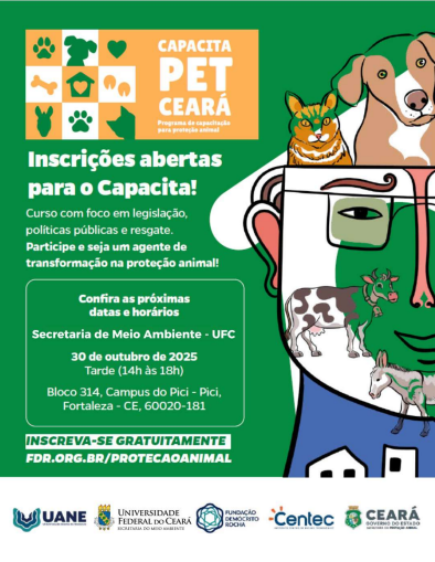 A Secretaria do Meio Ambiente da Universidade Federal do Ceará (UFC) realizará, no dia 30 de outubro de 2025, mais uma edição do Capacita Pet Ceará – Programa de Capacitação para Proteção Animal, iniciativa voltada à formação de agentes e à promoção de políticas públicas em defesa dos animais. O encontro ocorrerá em dois turnos, das 9h às 12h e das 14h às 18h, na Sala Professor Luís Antônio Maciel de Paula, no Bloco 314 da Pró-Reitoria de Extensão (ao lado da Biblioteca Universitária), no Campus do Pici, em Fortaleza.