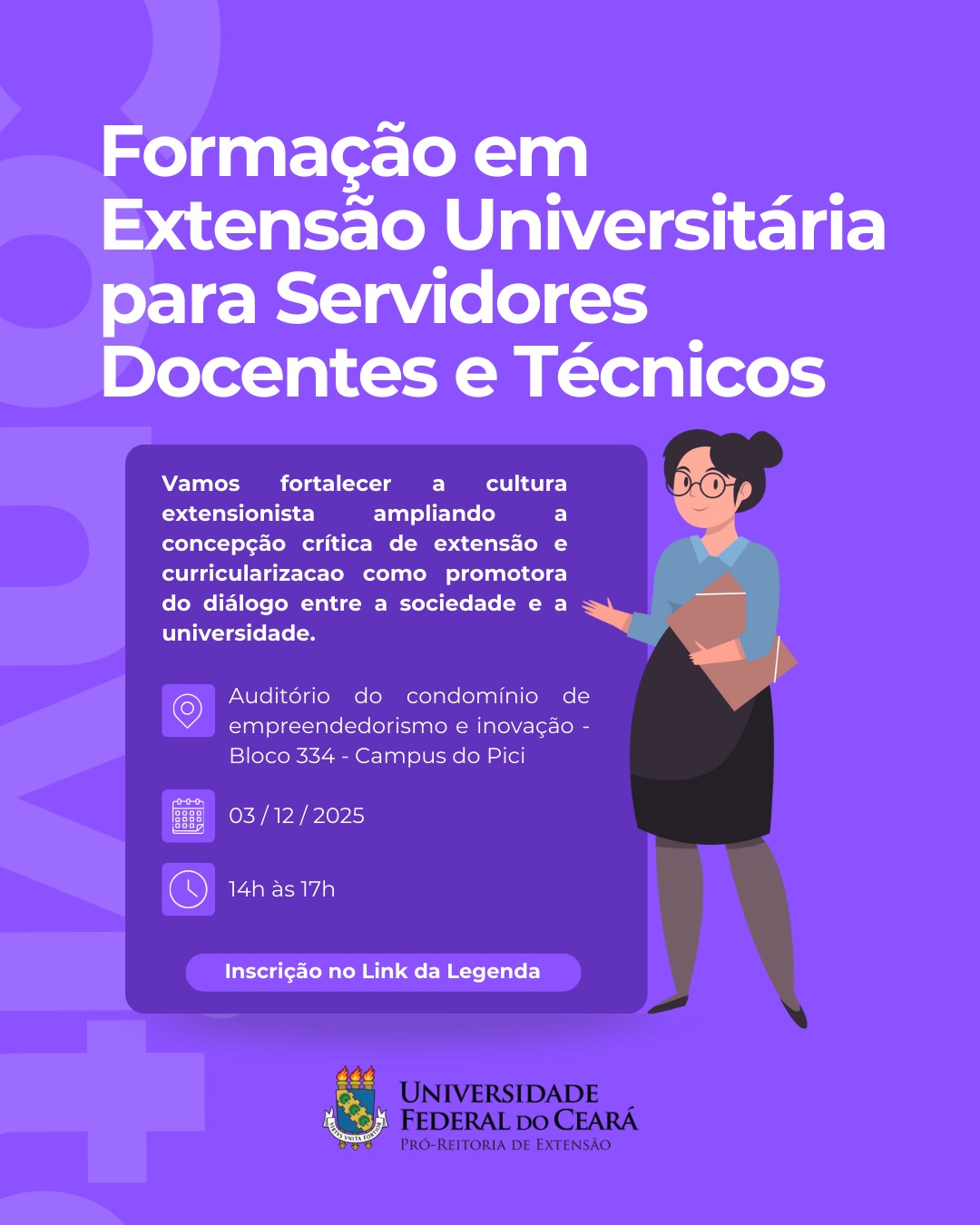A Universidade Federal do Ceará (UFC), por meio da Coordenadoria de Formação e Curricularização da Extensão (Formace) e da Coordenadoria de Ações Curriculares de Extensão (CACE), realizará na quarta-feira, dia 3 de dezembro, das 14h às 17h, a atividade “Formação em Extensão Universitária para Servidores Docentes e Técnicos”. O encontro acontecerá no Auditório do Condomínio de Empreendedorismo e Inovação (CEI), Bloco 334, no Campus do Pici.