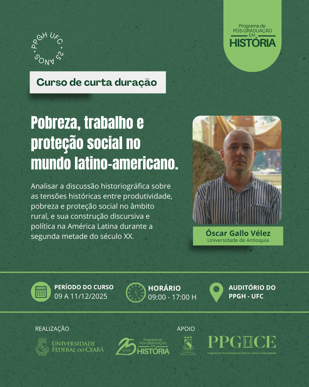 O Programa de Pós-Graduação em História da Universidade Federal do Ceará (PPGH-UFC) recebe, de 8 a 12 de dezembro, o professor Óscar Gallo Vélez, da Universidade de Antioquia (Colômbia), para uma agenda acadêmica que inclui conferência, curso de curta duração e reuniões técnicas. As inscrições estão abertas.