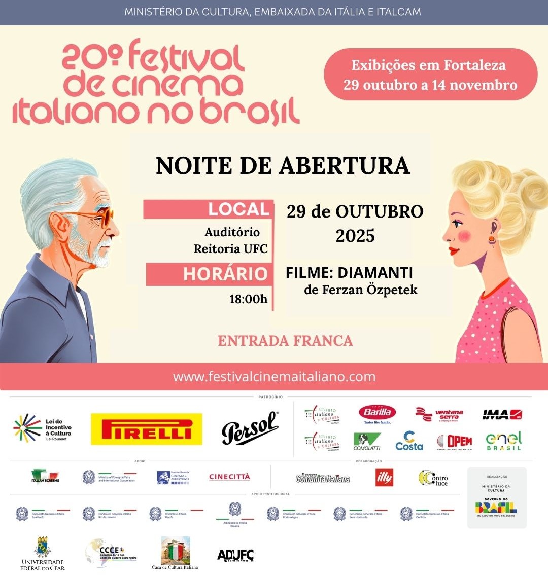 A Casa de Cultura Italiana promove, em Fortaleza, a 20ª edição do Festival de Cinema Italiano no Brasil – promovido pelo Ministério da Cultura, pela Embaixada da Itália e pela Câmara de Comércio Italiana em São Paulo. O evento nacional, realizado em várias cidades, tem como tema “Il Cinema che Racconta, I Maestri che Ispirano” – O Cinema que Conta, Os Mestres que Inspiram.
