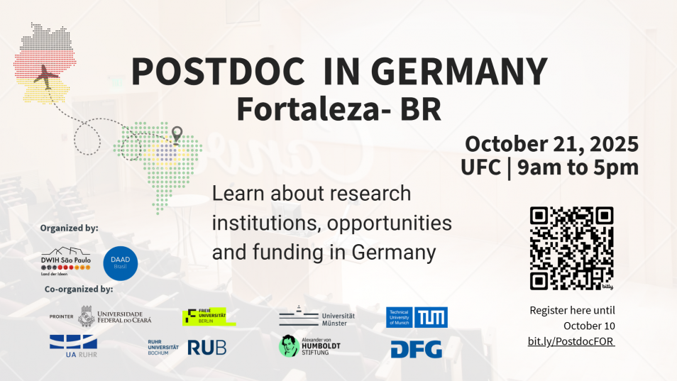 No dia 21 de outubro, de 9h às 17h, o Auditório da Reitoria da Universidade Federal do Ceará (UFC), recebe o workshop Postdoc in Germany 2025, evento gratuito com inscrições abertas até 10 de outubro.